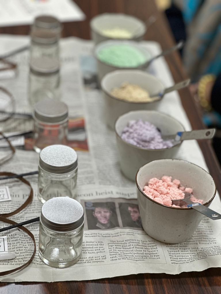 • ロウソクが1本入った小瓶の中に、お好きな色のロウを入れていっていただきます。