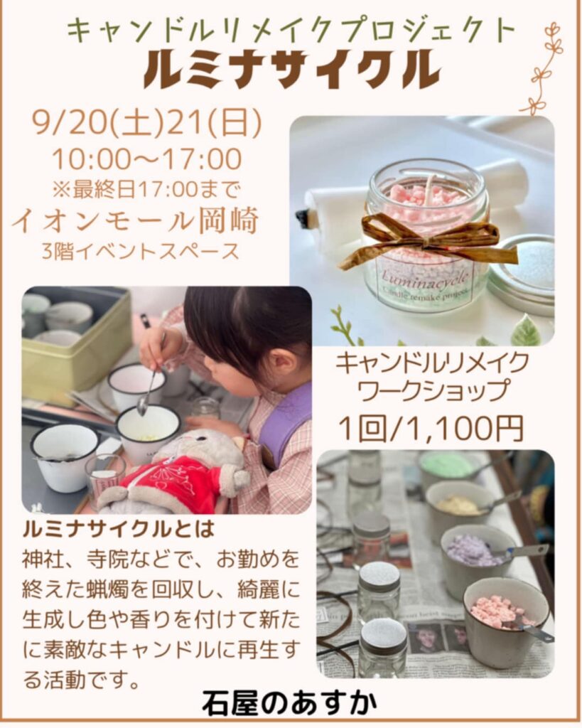 イオンモール3Fで開かれる第5回おかざき魅力発信展に、石屋のあすかは、ルミナサイクルで出店参加させていただき、【キャンドルリメイク・ワークショップ】を開きます。